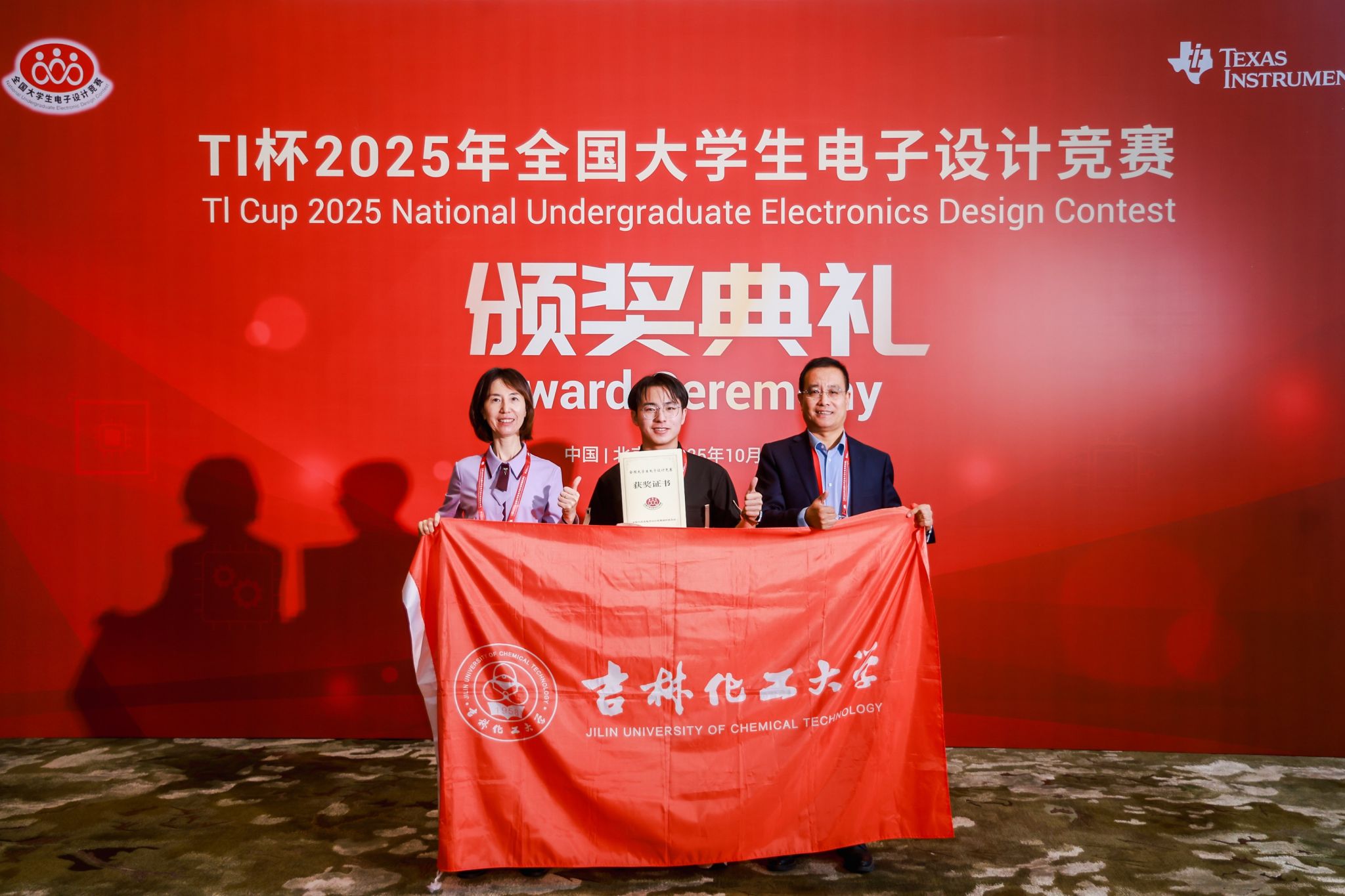 10月18日,2025年全国大学生电子设计竞赛(TI杯)颁奖大会在北京举行。我校教务处处长姜德龙,指导教师张慧颖,获奖学生代表邹文博,一同受邀参会并登台领奖。